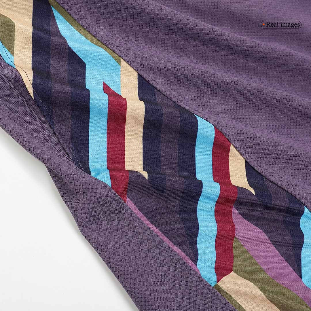 The new England away soccer kit Euro 2024 features a dark pale maroon with colorful side panels. There are seven different colours in the playful graphic side panels, with gold detailing on the brand and three Lions badge. The highlight of cheap England jersey EURO 2024 away is the multi-color design on both sides. There is a St. George's Cross on the inside of the collar of England jersey in the same color as the side stripes. Although England jerseys, England authentic jerseys, and England long sleeve jerseys are replica jerseys, these jerseys are almost exactly the same as those on the official website. The fabric of England jerseys, England authentic jerseys, and England long sleeve jerseys are skin-friendly, smooth, breathable and light.