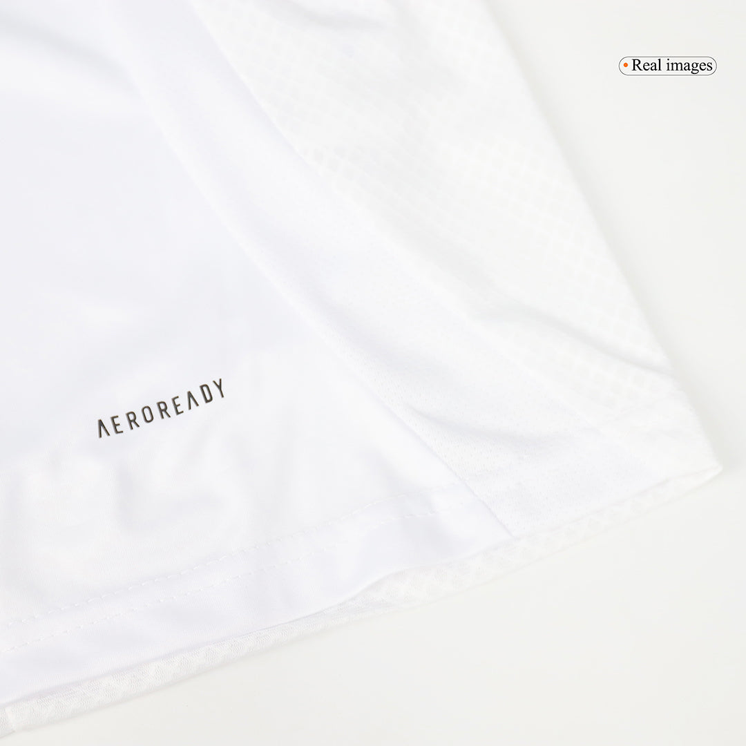 Patterns and Colors: Real Madrid's classic, pure white is used on the shirt, a hue that has come to symbolize the team's remarkable past and current achievements. The jersey's simple style is emphasized by the striking contrast created by the black shoulder stripes, which give it a contemporary edge. The club's emphasis on sophistication both on and off the field is reflected in the jersey's beauty and simplicity.